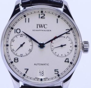 This is a classic replica IWC Portuguese seven-day chain watch with a diameter of 42.3 mm, a stainless steel case, and a blue alligator leather strap. The watch is equipped with the IWC self-produced cal.51011 self-winding movement, which can provide a power reserve of 168 hours when fully wound, which is a full seven days, which is also the origin of the name replica IWC Portuguese Seven.
